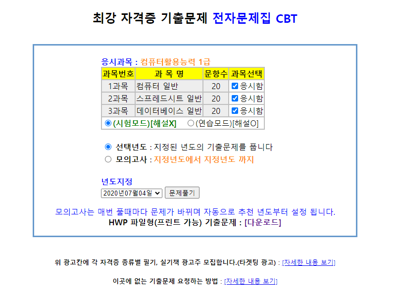 OMR 방식 - '문제풀기' 선택 하고 다음페이지에서 과목 '컴퓨터 활용 능력' 고른후 '선택' 버튼 2번 클릭해주시면 됩니다.