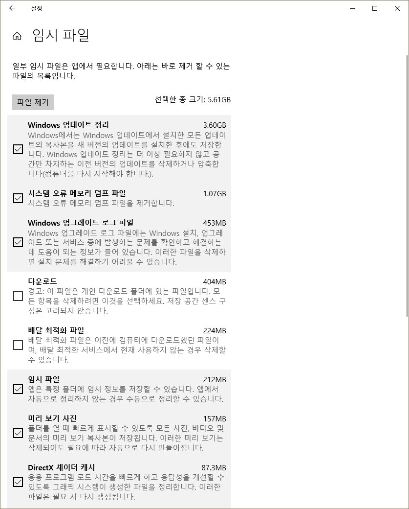 처음부터 선택 되어있는 파일들은 바로 지워도 크게 상관없는 파일들입니다.
